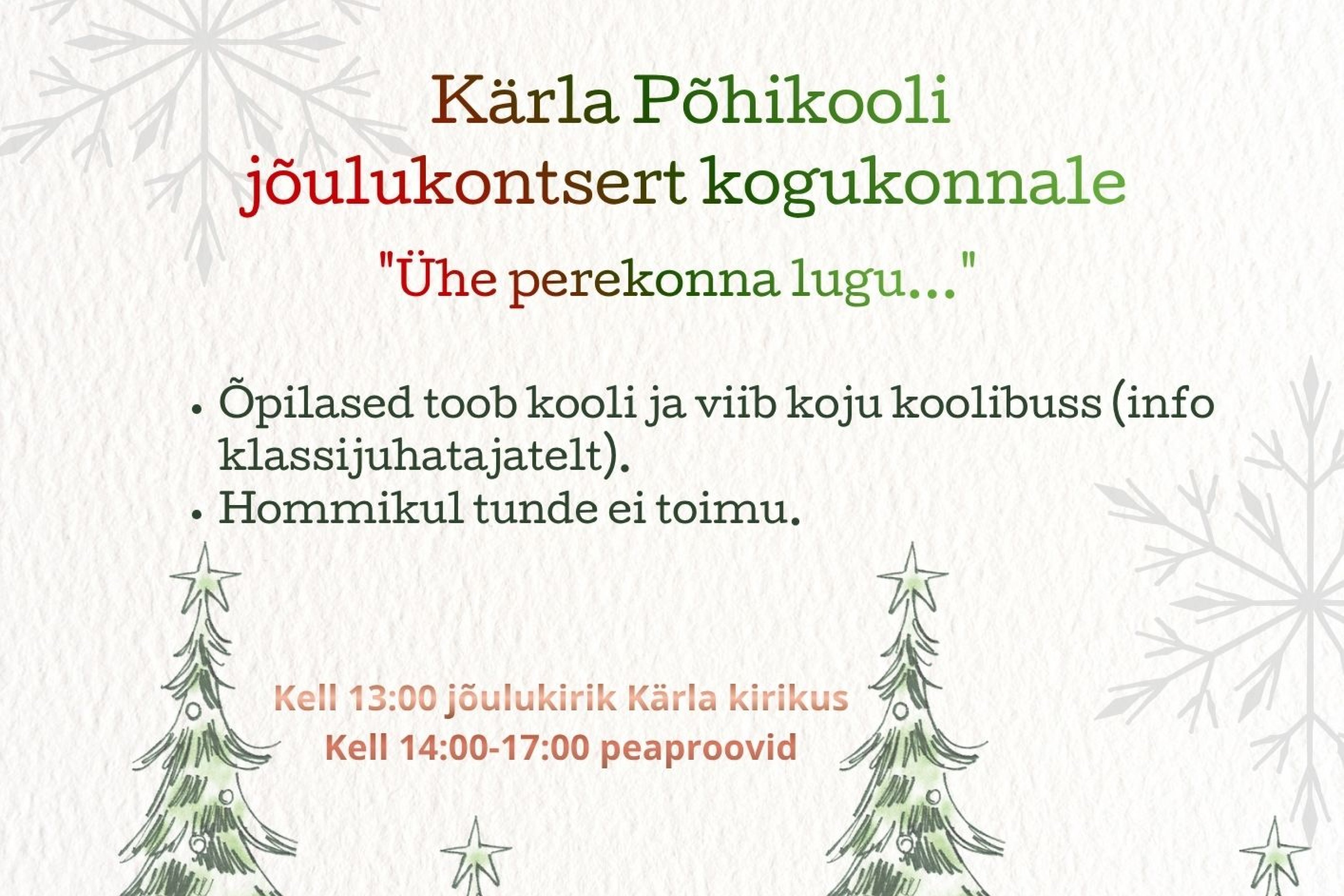 Kooli jõulukontsert "Ühe perekonna lugu..." toimub 19. detsember kell 17:30 Kärla rahvamajas, kuhu on oodatud lapsevanemad, kogukonna liikmed.