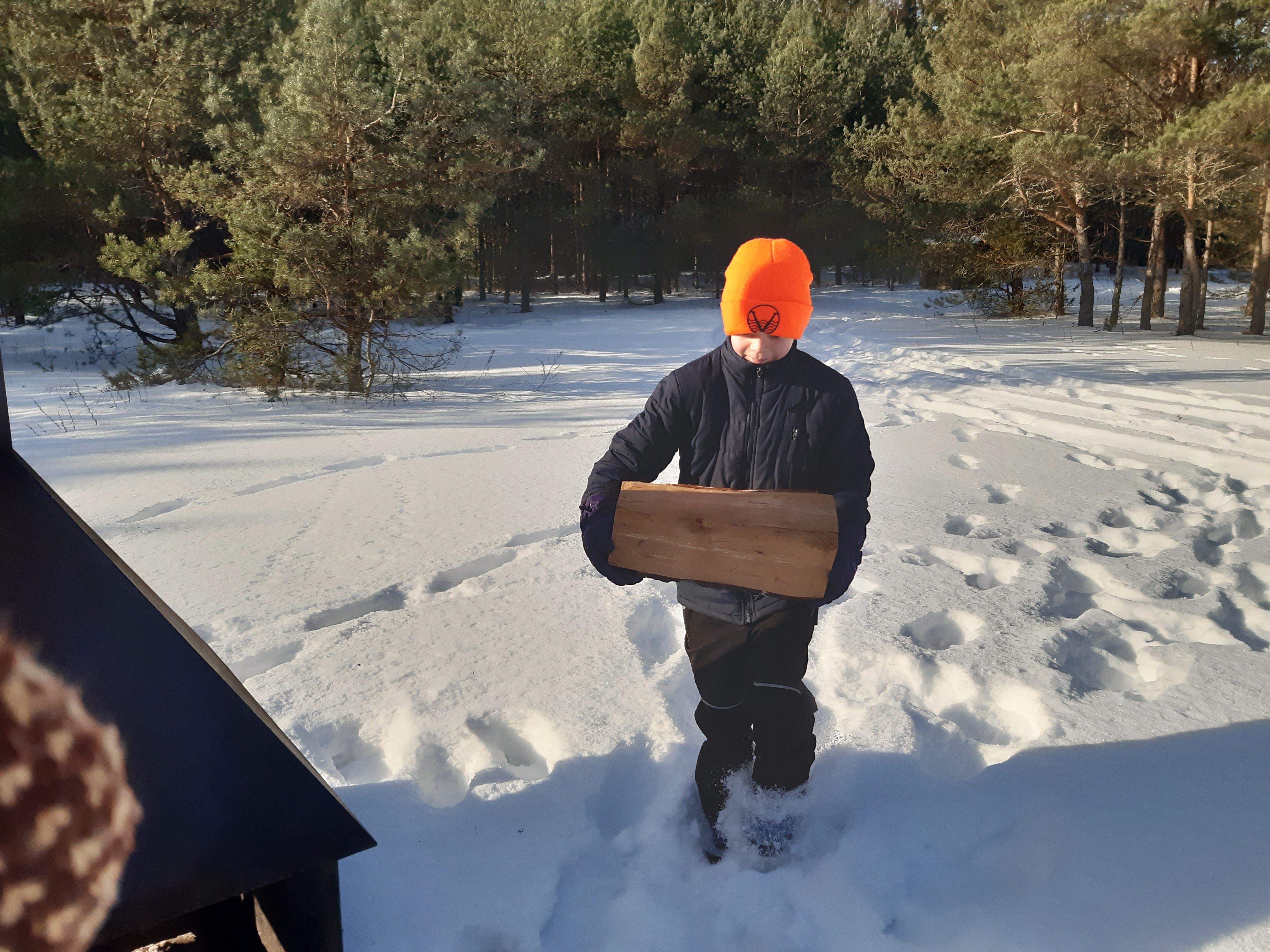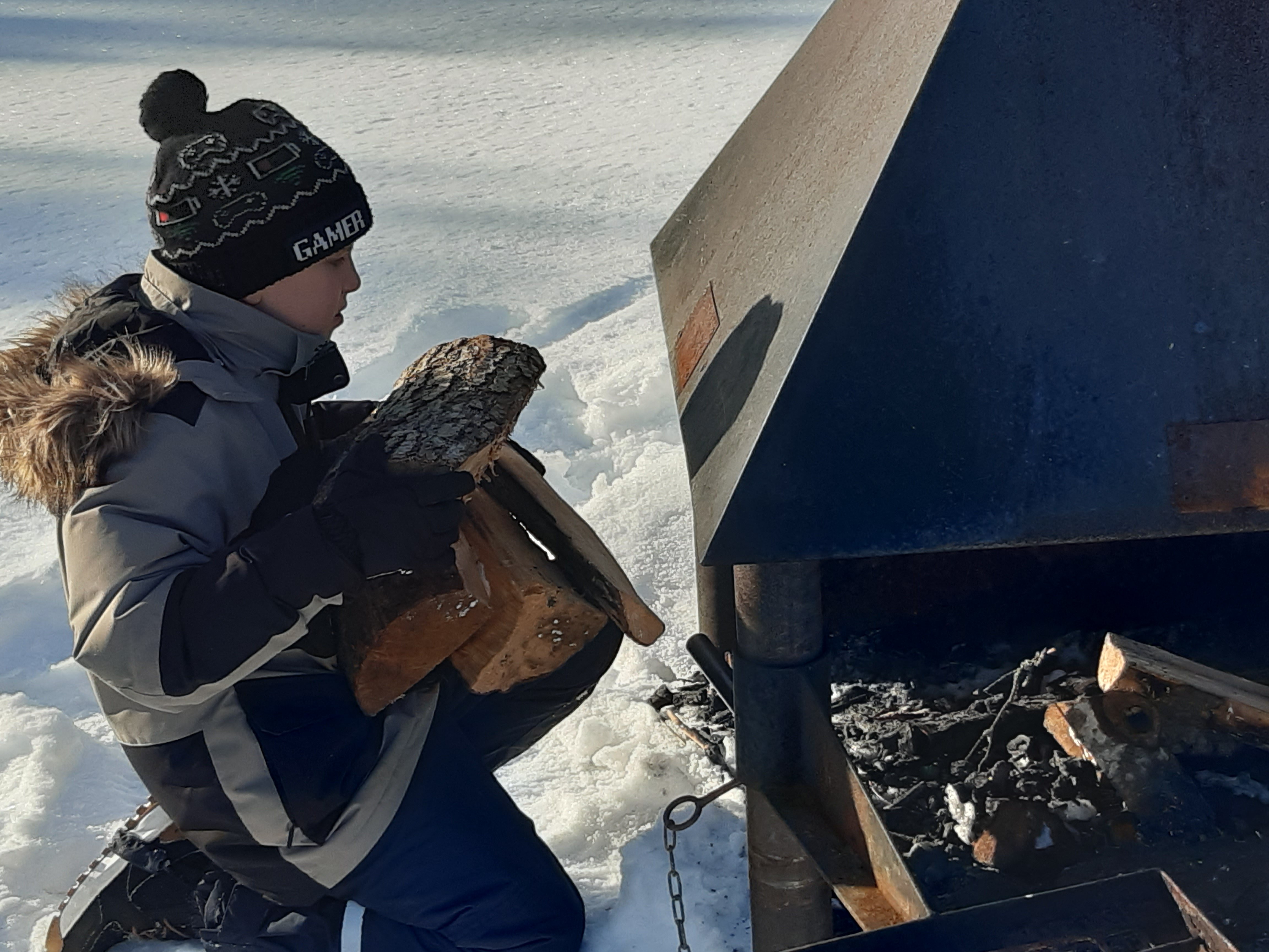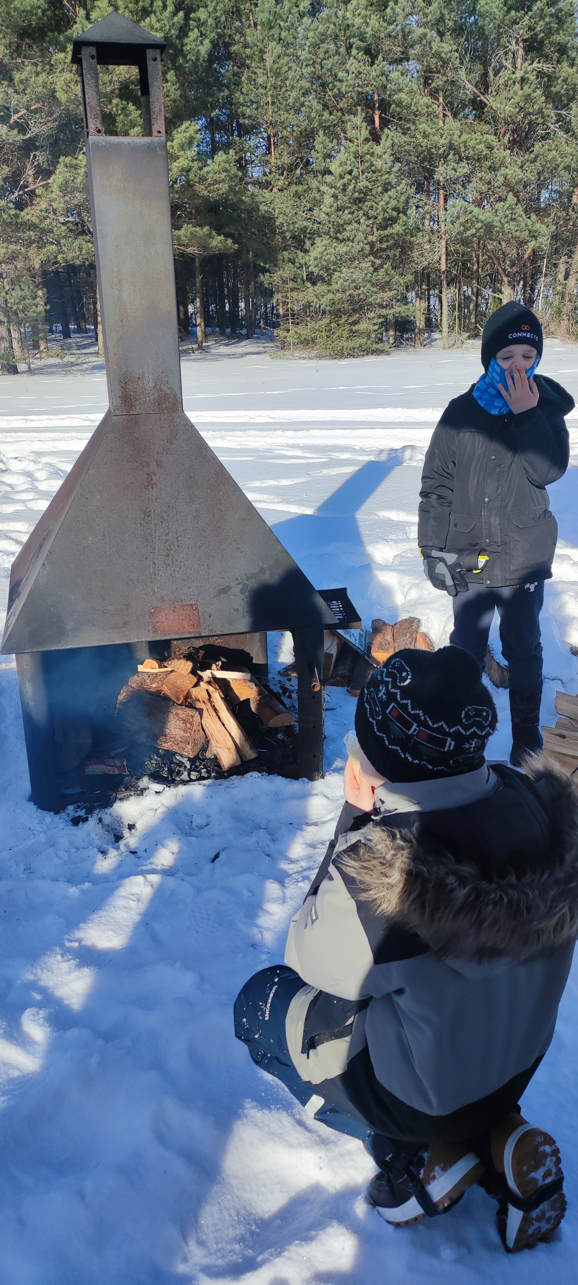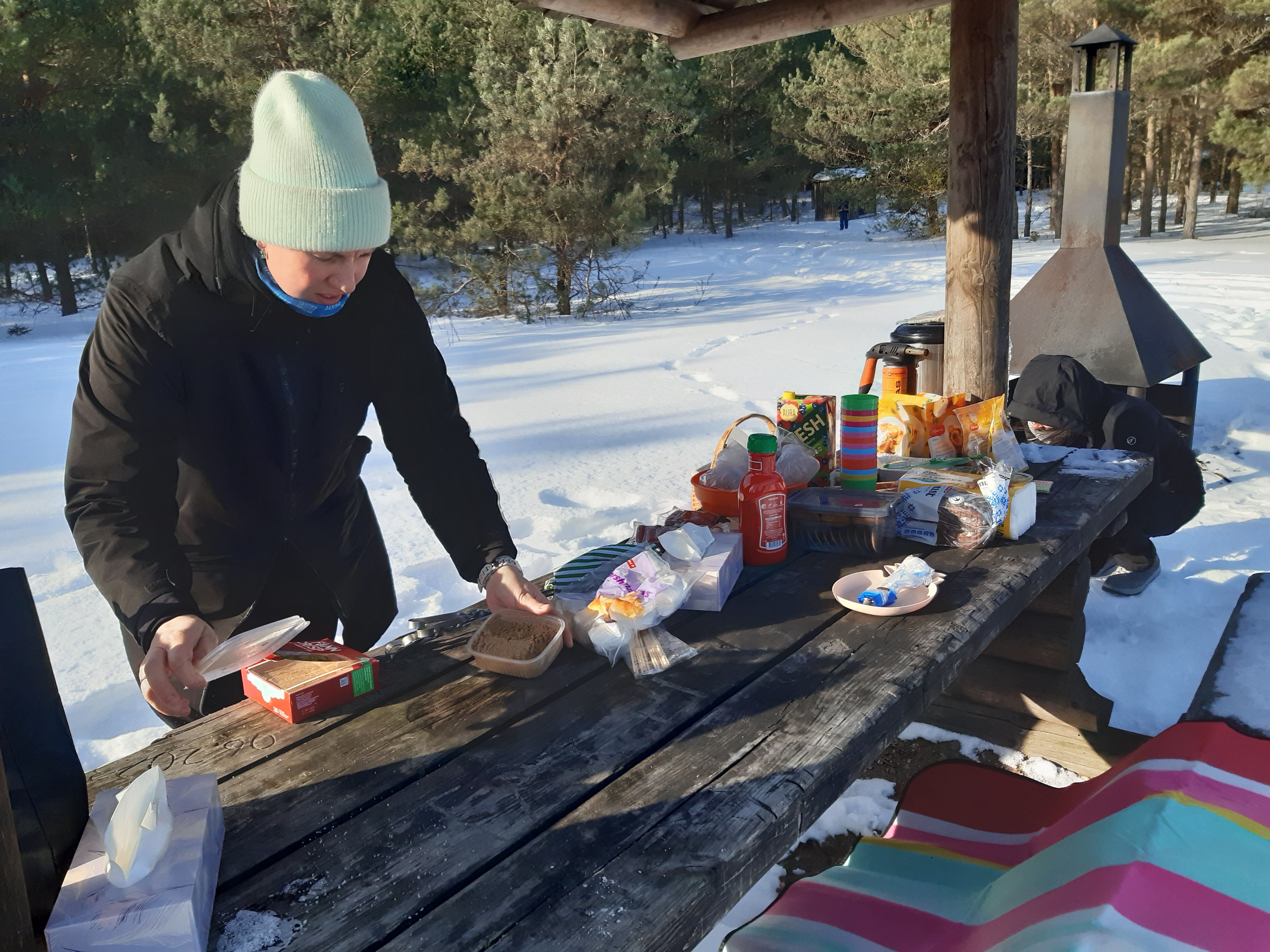 Lastevanemate vahel olid jaotatud ülesanded – kes võttis kaasa grillvorstid, kes kuivad küttepuud ning kes sooja tee. Kohale jõudes ootas meid lõkkeplats, pikniku laud, mida kaunistas päikesepaiste, sinine taevas ning sätendav lumi järvejääl. Mehed ja noormehed tõid lõkkepuud ja tegelesid grilli ettevalmistusega. Lisaks sellele oli üks lapsevanem kaasa võtnud kondenspiima, vahukoore, kausi ja vispli, selleks et lume peal jäätist valmistada. Jäätise valmistamisega tegelesid enamasti tüdrukud, aga nautida said kõik – maitsev jäätis maandus vahvlitopsi! Kui lõke üleval, oli võimalus grillvorste sussutada – hirvelihast ja metssealihast. Ning mis oleks värskes õhus veel maitsvam kui lõkkemaitsega vorstike, lõkkeleib ja ketšup. Muud lisandid ja snäkid oli igaüks ise kaasa valinud.