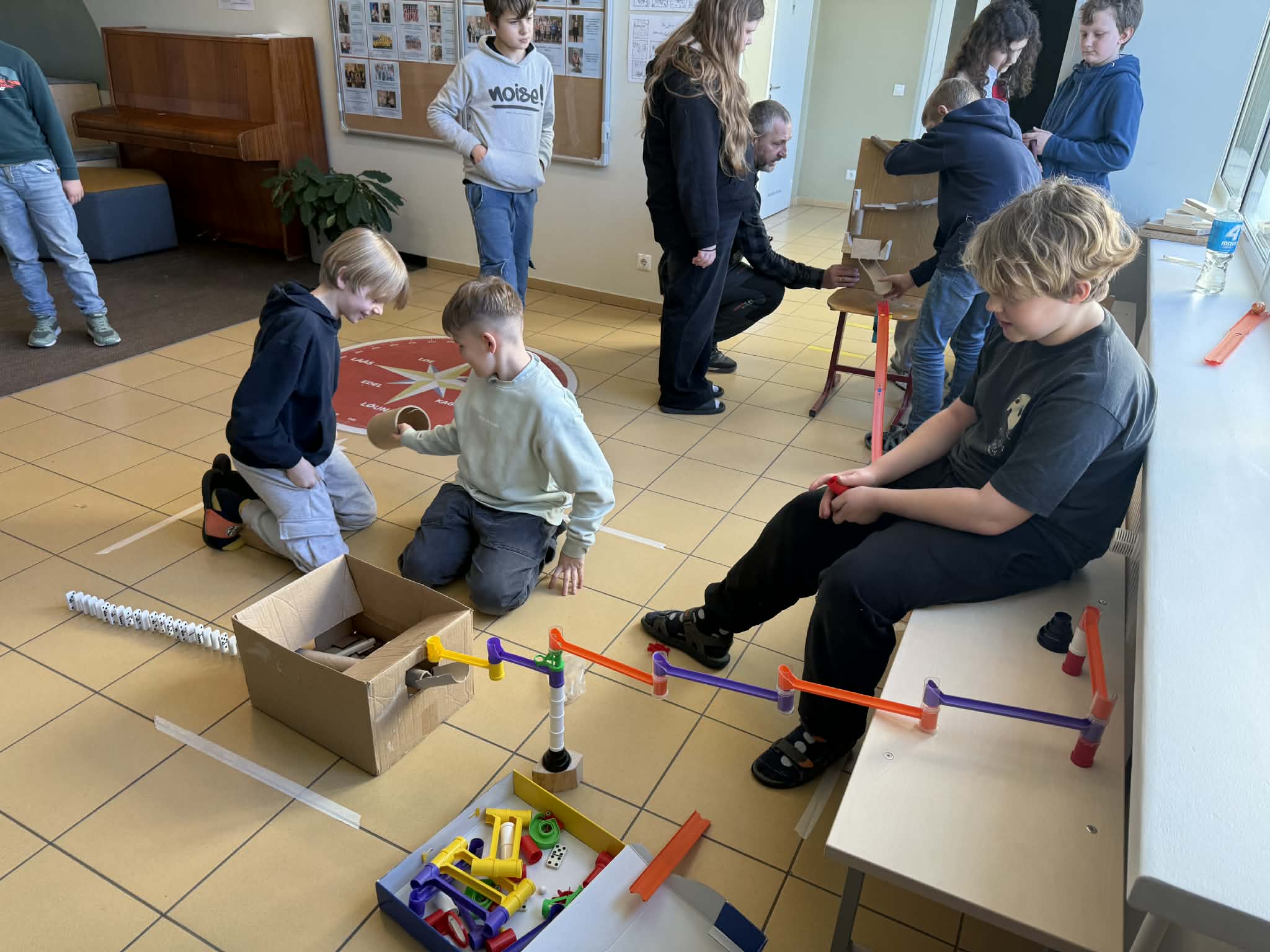 Kõigepealt tuli õpilastel ise mõõta ja maha märkida teibiga Goldbergi masina aluspind. Siis sai masinaid korda sättima hakata. Nii mõnigi tiim mõistis, et õpetaja poolt varem antud planeerimise ja ehitamise aega oleks pidanud hoolikamalt kasutama, sest viimasel hetkel tegutsemine on küll produktiivne, sest võistlusmoment paneb tööle, aga palju parema tulemuse oleks saanud, kui oleks varasemat planeerimise aega targemalt ära kasutanud.