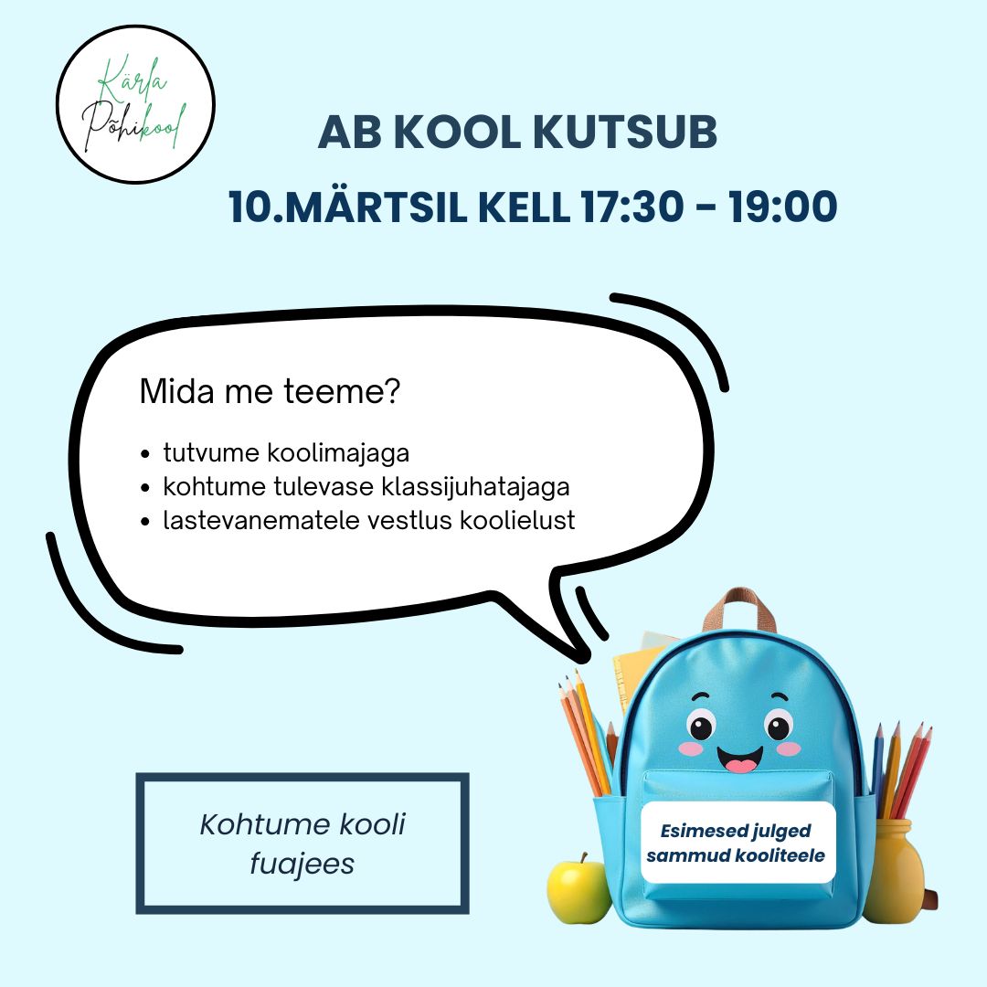 Kärla kool alustab kohtumisi AB koolis oma tulevaste õpilaste ja nende vanematega. Ootame osalema nii meie kogukonna peresid kui ka neid, kes alles kaaluvad oma lapse kooliteed Kärla koolis.