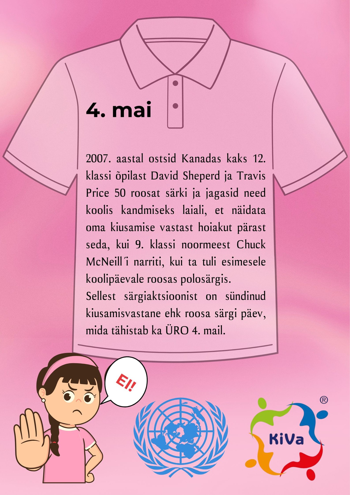 ÜRO tähistab 4. mail kiusamisvastast päeva, mida sümboliseerib roosat värvi särgi kandmine.