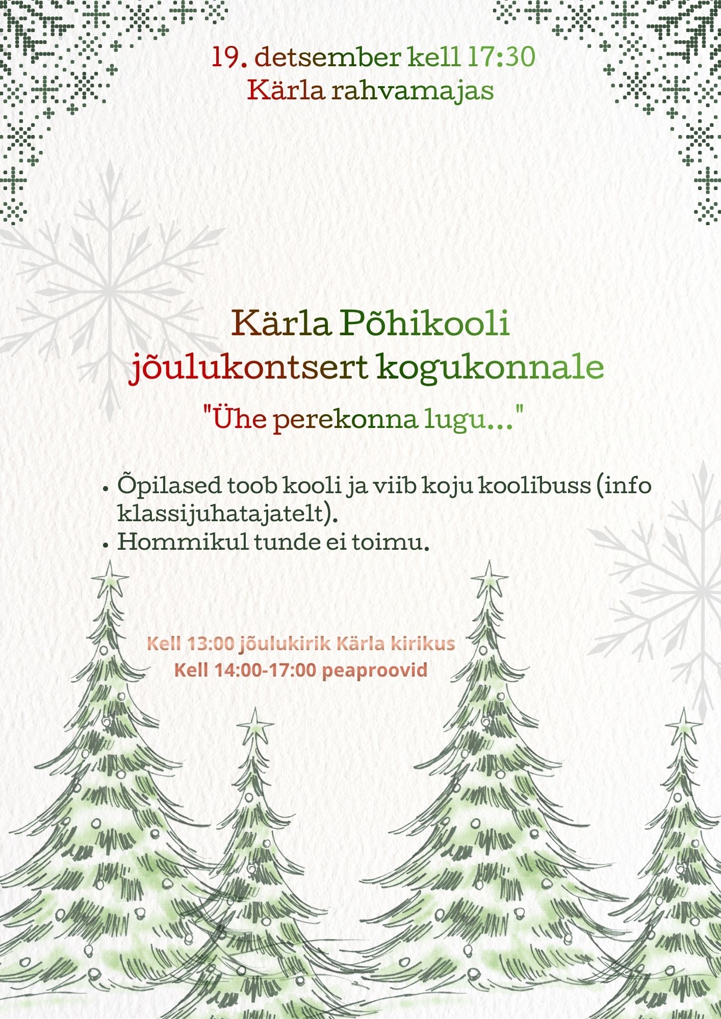 Kooli jõulukontsert "Ühe perekonna lugu..." toimub 19. detsember kell 17:30 Kärla rahvamajas, kuhu on oodatud lapsevanemad, kogukonna liikmed.