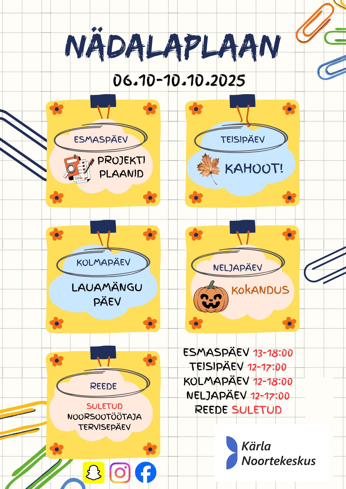 Fotokonkurss "Saaremaa pärlid" Loomise kuupäev 26.09.2025 Autor Kärt Aulik 5. - 9. klassi TORE Loomise kuupäev 22.09.2025 Autor Kärt Aulik Noorteka nädalaplaan Loomise kuupäev 22.09.2025 Autor Kärt Aulik Noorteka nädalaplaan Loomise kuupäev 15.09.2025 Autor Kärt Aulik Vaata rohkem