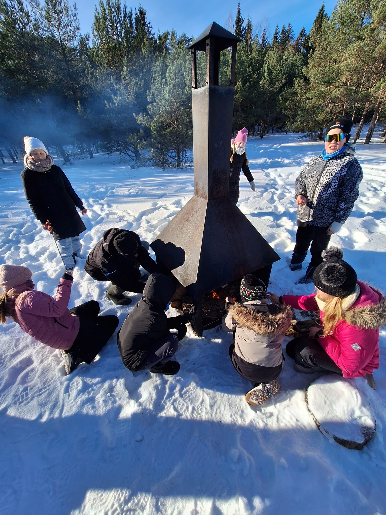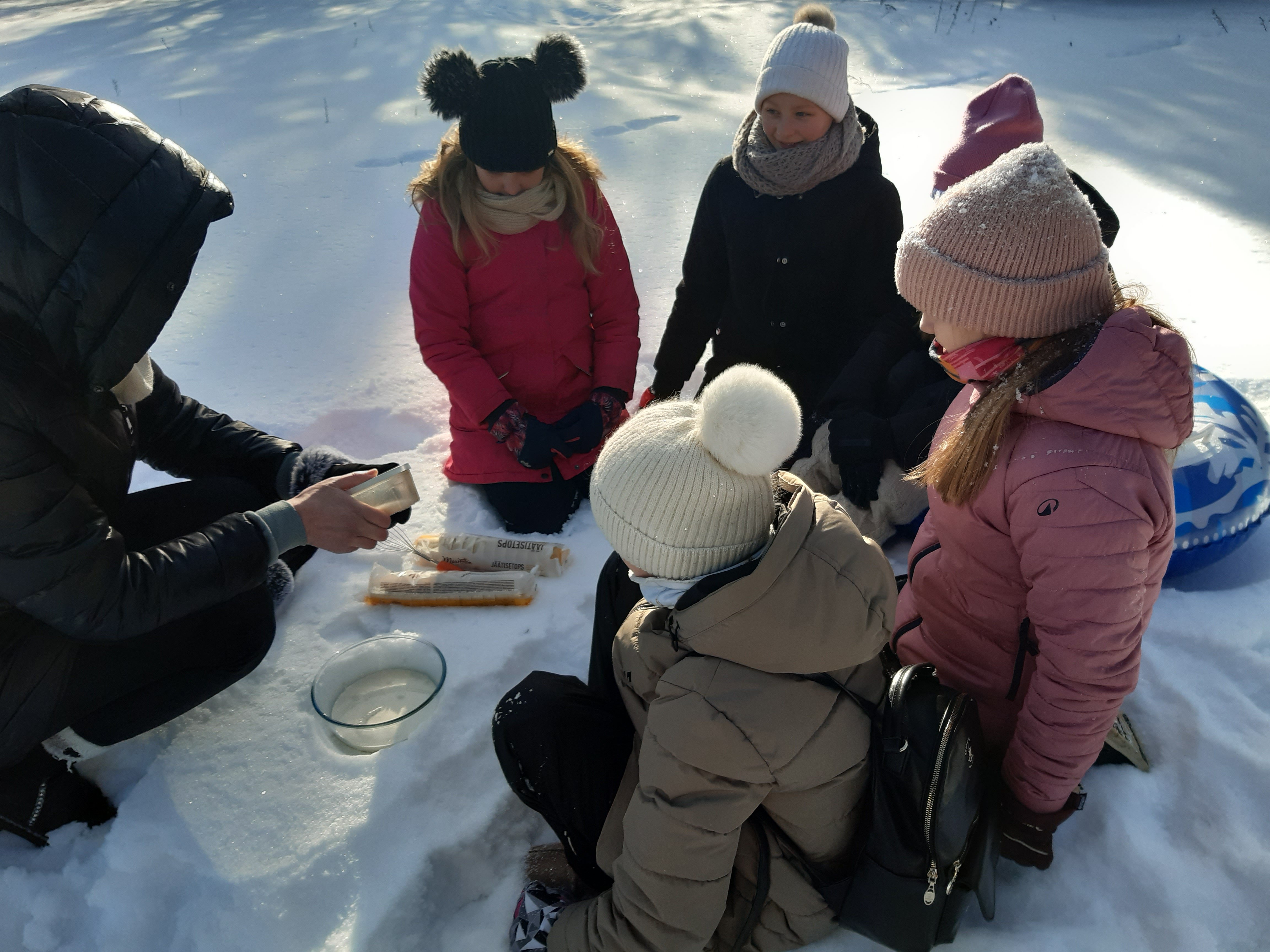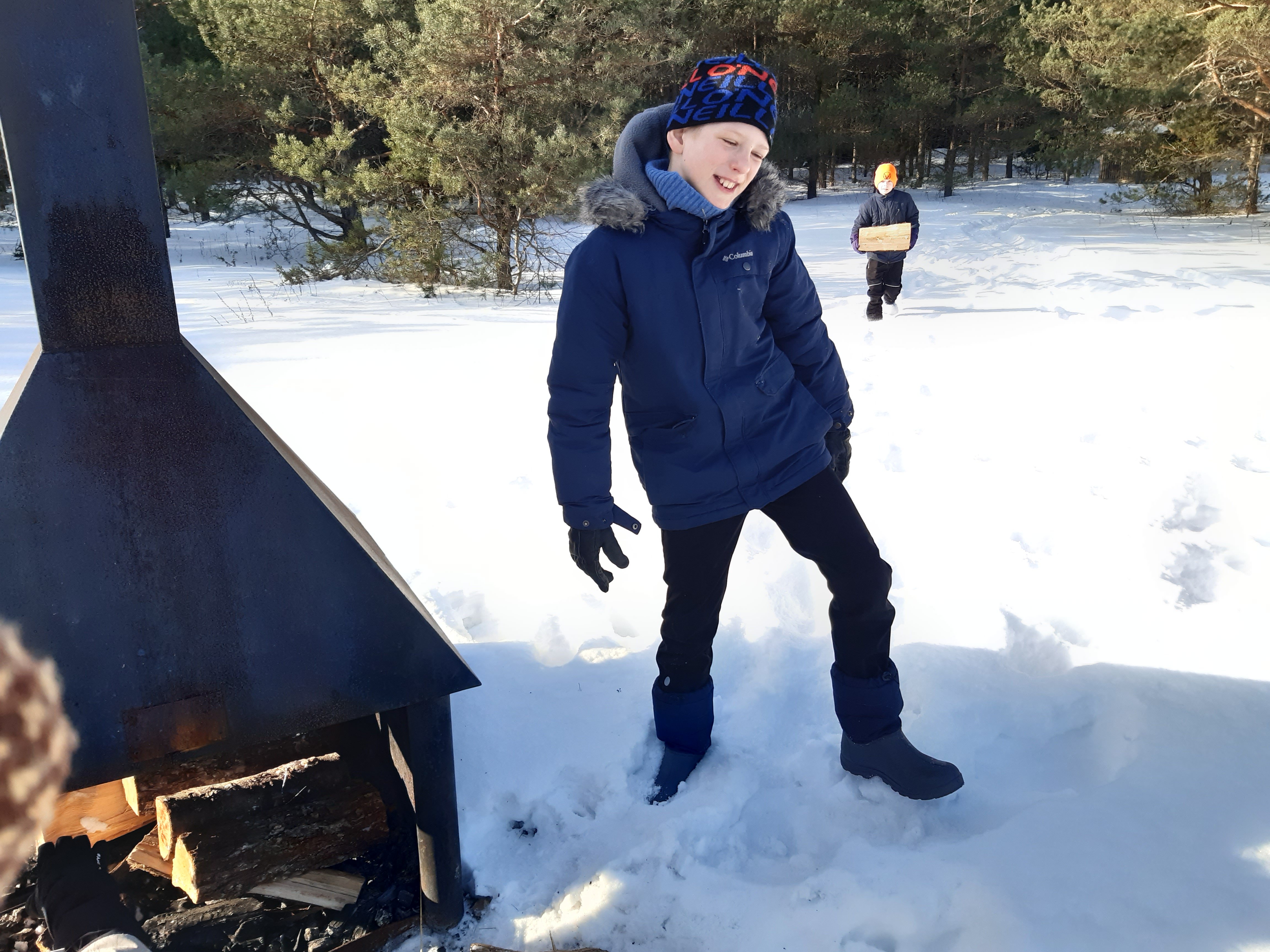 Lastevanemate vahel olid jaotatud ülesanded – kes võttis kaasa grillvorstid, kes kuivad küttepuud ning kes sooja tee. Kohale jõudes ootas meid lõkkeplats, pikniku laud, mida kaunistas päikesepaiste, sinine taevas ning sätendav lumi järvejääl. Mehed ja noormehed tõid lõkkepuud ja tegelesid grilli ettevalmistusega. Lisaks sellele oli üks lapsevanem kaasa võtnud kondenspiima, vahukoore, kausi ja vispli, selleks et lume peal jäätist valmistada. Jäätise valmistamisega tegelesid enamasti tüdrukud, aga nautida said kõik – maitsev jäätis maandus vahvlitopsi! Kui lõke üleval, oli võimalus grillvorste sussutada – hirvelihast ja metssealihast. Ning mis oleks värskes õhus veel maitsvam kui lõkkemaitsega vorstike, lõkkeleib ja ketšup. Muud lisandid ja snäkid oli igaüks ise kaasa valinud.